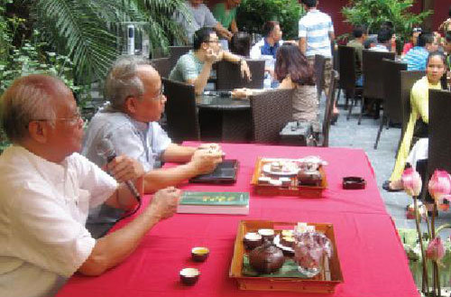 TTCT - Bên chén trà vàng óng, vị thanh nhẹ thoảng mùi thơm kỳ lạ, Đoàn Hùng Sơn giới thiệu đây là trà cổ thụ trăm năm tuổi mọc trên đỉnh Phanxipăng. Đây cũng là lần đầu tiên những người yêu trà Hà thành được thưởng thức loại trà quý hiếm này thông qua chuỗi chương trình Dân gian trà Việt. Nghệ nhân trà sen Đoàn Hùng Tiến (trái) trong buổi nói chuyện với người yêu trà Hà Nội - Ảnh: N.Đ.Nhiều người uống trà, nhiều vùng trồng trà, nhưng không phải ai cũng biết Việt Nam đang sở hữu nhiều giống trà đặc sản, đặc biệt là trà cổ thụ, đứng đầu thế giới về số lượng và vùng phân bố. Bên cạnh đó, Việt Nam còn có nhiều loại trà ướp hương độc đáo mà tiêu biểu là trà sen.Một tháng chuẩn bị cho 3 giờLàm thế nào để thưởng thức hương vị trà của các vùng miền Việt Nam một cách mộc mạc, gần gũi nhất? Từ suy nghĩ ấy, Đoàn Hùng Sơn cùng những người trẻ gắn bó với ngành trà Việt kết hợp cùng Hiệp hội Chè Việt Nam chung tay xây dựng chương trình mà nhóm đặt tên là Dân gian trà Việt, tổ chức các buổi thử trà tại Hà Nội theo định kỳ hằng tháng ở quán cà phê Tonkin trên đường Hai Bà Trưng.Ở mỗi chương trình, Sơn và Hiệp hội Chè Việt Nam mời các chuyên gia giới thiệu chuyên sâu về một loại trà, kết hợp với việc phục vụ cách uống trà gần gũi, không nghi thức cầu kỳ, cốt yếu để người yêu trà đón nhận hương vị trà một cách thuần khiết nhất.Chương trình đầu tiên diễn ra trong tháng 8, cũng đang mùa sen nên chủ đề xoay quanh câu chuyện trà sen, do ông Đoàn Hùng Tiến - nghệ nhân trà sen, nguyên viện trưởng Viện Nghiên cứu chè Việt Nam - chủ trì, chia sẻ những kiến thức về ướp trà sen theo cách xưa và nay. Người tham dự được thưởng thức hương vị sen xổi - một kiểu ướp trà trực tiếp vào trong búp sen trồng ở hồ Tây, đang dần quen thuộc với người yêu trà Hà Nội.Từ chỗ chỉ thu hút khoảng 50 người, nhưng lần giới thiệu trà cổ thụ lấy từ đỉnh Phanxipăng tháng 9 vừa qua đã có lượng khách tăng gấp đôi. Sơn cho biết: “Mỗi buổi giới thiệu kéo dài khoảng 3 giờ, nhưng việc chuẩn bị mất đến cả tháng. Có người uống sẽ thích, có người không, nhưng ít ra họ cũng biết được Việt Nam mình có những loại trà quý hiếm như thế”.Uống trà trong chén chiết yêu lớn theo kiểu dân dã - Ảnh: N.Đ.Cảm nhận vị rất khác biệtĐó là chia sẻ của anh Nguyễn Hồng Thái, một khách tình cờ của buổi giới thiệu trà cổ thụ Phanxipăng. “Tôi thường uống nước trà nấu từ lá tươi, nhưng quả thật khi uống chén trà này lại cảm nhận vị rất khác biệt, hậu ngọt thanh và kéo dài rất rõ” - anh nói.Buổi giới thiệu trà cổ thụ trên đỉnh Phanxipăng gây ngạc nhiên ở nhiều người, bởi nó lạ từ câu chuyện của vùng trà đến cách thưởng thức được chuẩn bị rất mộc mạc. Từ 6g sáng, Sơn cùng những người bạn đã có mặt ở cà phê Tonkin nấu nước pha trà, chuẩn bị trà cụ như nồi đất sưu tầm từ Nghệ An, chén bát từ lò gốm Bát Tràng, bày biện lá trà xanh lấy từ vùng trà cổ thụ Phanxipăng. Sơn chia thành hai loại để giới thiệu: trà xanh nấu trực tiếp trong nước sôi và trà đã sao sơ qua lửa, gọi là trà bạng - lá trà già được băm nhỏ, để héo, sao qua chảo cho rút hơi nước để dành uống dần. Uống trà bạng trong chén chiết yêu lớn là một kiểu uống dân dã ngày xưa mà nay đã không còn. Buổi ra mắt lần thứ ba cuối tháng 10, đang là mùa thu Hà Nội, hướng đến trà hoa (các loại trà ướp với hoa cúc, hoa nhài). Dù không qua giới thiệu đại chúng nhưng sự kiện đã thu hút lượng người tham dự lấp đầy địa điểm, có lẽ nhờ cách giới thiệu gần gũi về một sản phẩm quen thuộc trong đời sống mà không phải ai cũng có dịp tiếp cận một cách đầy đủ. “Với tôi, trà chỉ là thức uống nên cách thưởng thức đừng quá cầu kỳ, phức tạp. Người Hà Nội quen nghĩ trà - thuốc gắn với đàn ông, nhưng tôi lại thấy phụ nữ rất thích thú khi thưởng thức trà hoa” - anh Đặng Huy Hùng, một người yêu trà, chia sẻ.Trà cụ phục vụ buổi giới thiệu trà cổ thụ Phanxipăng - Ảnh: N.Đ.Trà hoa là một bất ngờ thú vị đối với khách nữ - Ảnh: N.Đ.Đoàn Hùng Sơn trong hành trình lên rừng trà cổ thụ Phanxipăng - Ảnh: N.Đ.Trà cổ thụ PhanxipăngTrong số các vùng trà cổ thụ Việt Nam, những vùng trà được cộng đồng bản địa (chủ yếu là người Dao, Mông…) khai thác lâu đời gồm có Suối Giàng, Tủa Chùa, Tà Xùa, và các vùng trà cổ thụ ở Hà Giang. Riêng rừng trà mọc ở độ cao 2.500m trên đường lên đỉnh Phanxipăng được phát hiện muộn nhất, khoảng bốn năm nay. Đây là rừng trà cổ thụ nguyên sinh, chưa thu hái chế biến thành phẩm. Rừng trà mọc thành một vạt lớn, các thân trà kích cỡ một đến hai người ôm, cao trung bình 15-30m, mọc xen với cây rừng.Các vùng trà cổ thụ đều có điểm chung là không chăm bón bằng phân thuốc. Hiện ch