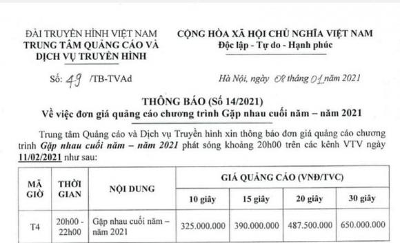 Để có 10 giây quảng cáo trong chương trình này, doanh nghiệp sẽ phải chi 325 triệu đồng/lần phát sóng. Với thời lượng phát sóng 15 giây, mức giá quảng cáo Gặp nhau cuối năm 2021 là 390 triệu đồng/lần phát sóng, 20 giây là 487,5 triệu đồng/lần phát sóng và 650 triệu đồng cho 30 giây/lần phát sóng.