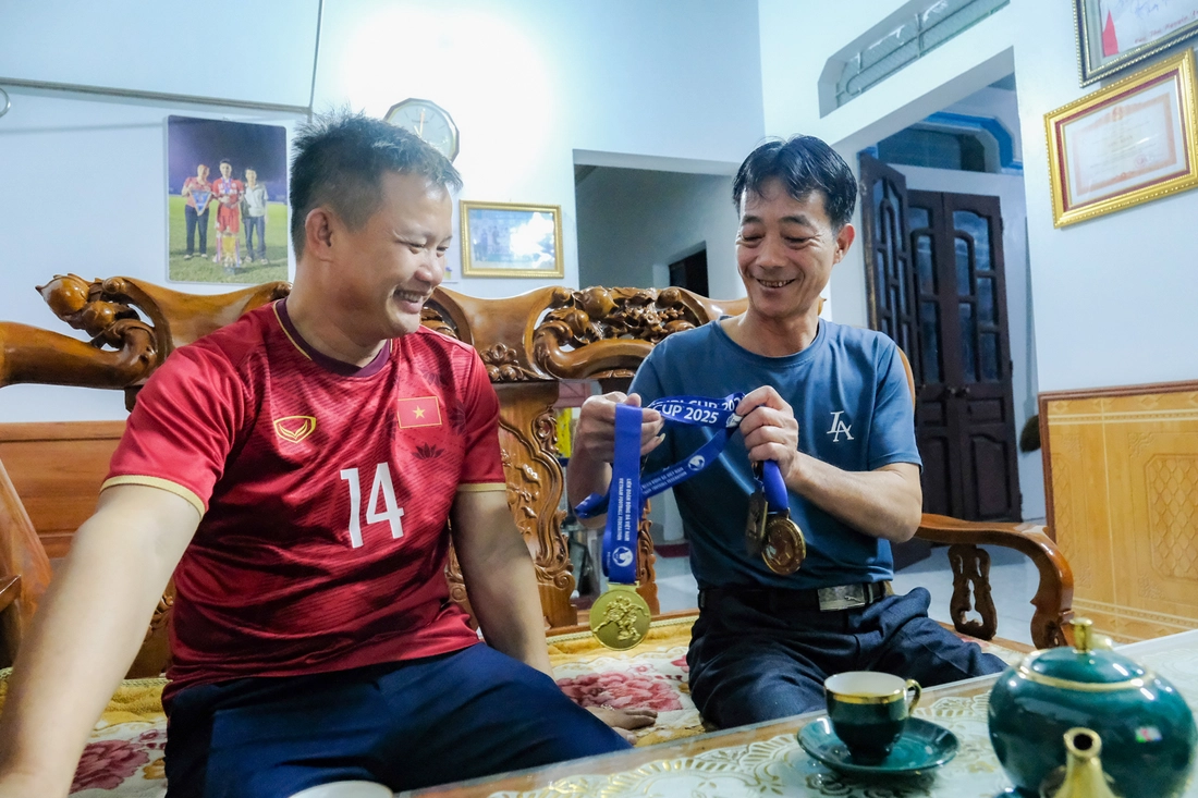 Ông Nguyễn Xuân Huy (phải), bố cầu thủ Nguyễn Xuân Bắc, khoe những tấm huy chương của con ở các giải đấu quốc tế - Ảnh: HÀ QUÂN
