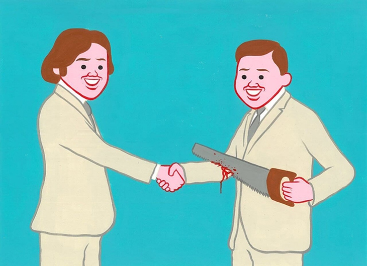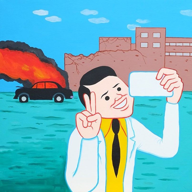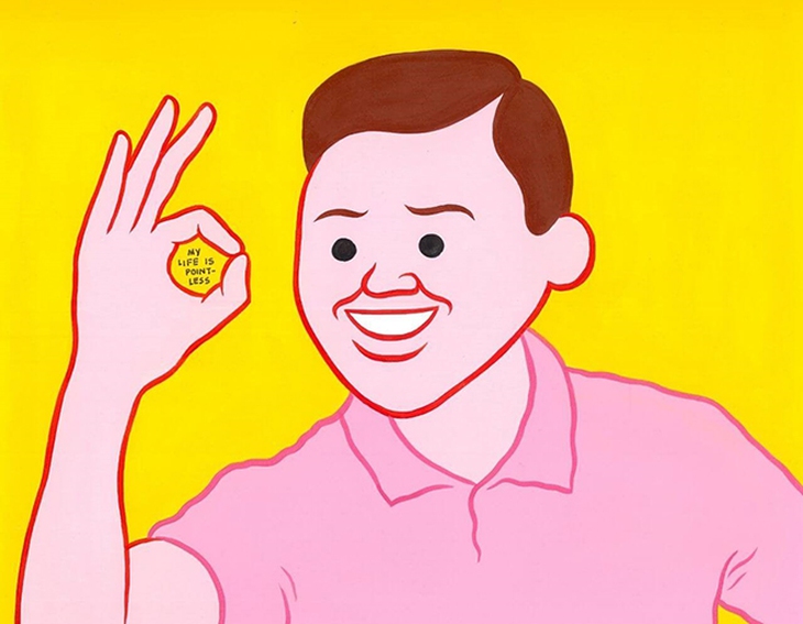 “Tôi đồng tình với một câu của diễn viên hài Bill Hicks, có một sự bình đẳng trong toàn thể nhân loại chúng ta. Chúng ta người nào cũng tào lao. Trong tranh của tôi, các nhân vật đều có vẻ giả tạo và nở nụ cười to tướng bất kể những gì điều khủng khiếp thường trực xảy ra. Mọi sự đều được thổi phồng lên, dù ta có thể cảm thấy một số quen thuộc từ trong cuộc sống”.