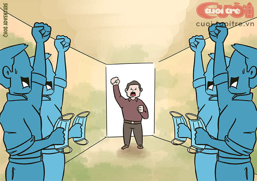 Giám đốc khích tướng nhân viên: "Các bạn hô to mục tiêu mà đeo khẩu trang à!". Ngay lập tức hơn 30 nhân viên máu anh hùng nổi lên rần rần. Giám đốc đã "động viên" thì con sợ thằng Tây nào nữa. Thế là tất cả tháo khẩu trang, hô hào mục tiêu phải đạt được doanh số với khí thế ngút trời mây.