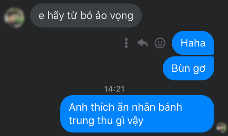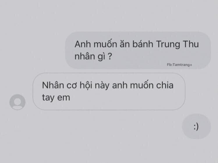 Ăn phải nhân bánh trung thu này thì đúng là chẳng thể nuốt trôi.Đoạn bình luận này đã nhanh chóng tạo thành một chủ đề vô cùng hấp dẫn trên mạng xã hội. Nhiều "dư luận viên" cho rằng đây sẽ là một trong những cách để nói lời chia tay người yêu vô cùng văn minh, tế nhị trong mùa Trung Thu. Một bộ phận khác thì bày tỏ, chàng hoặc nàng chỉ muốn xem phản ứng của bạn thế nào thôi; nếu mọi thứ kết thúc một cách nhẹ nhàng thế này chắc hẳn đôi bên cũng chẳng sâu đậm gì.