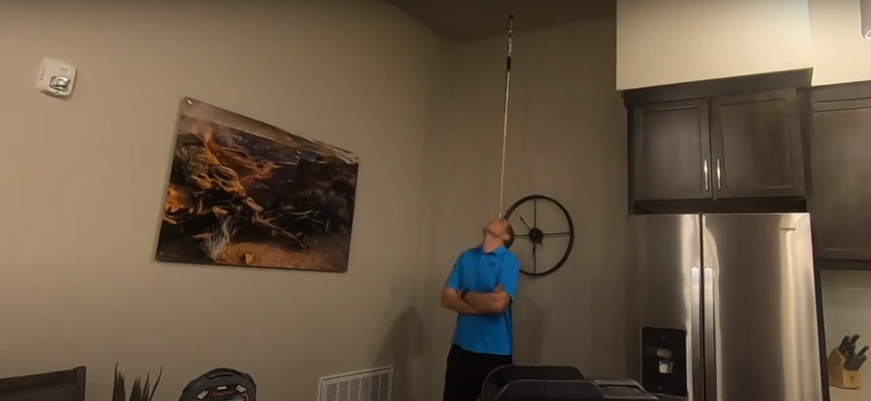 Ông David Rush giữ thăng bằng với cây cơ billiard trên trán - (Ảnh chụp màn hình)