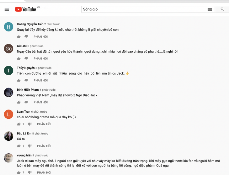 Theo đó, loạt sản phẩm đã được phát hành như MV Sóng gió, fanpage chính thức của Jack đều bị netizen tấn công với mong muốn nam ca sĩ lên tiếng phản hồi sự việc. Dưới link phát hành MV Sóng gió - sản phẩm kết hợp của Jack và K-ICM có sự tham gia của Thiên An cũng trở thành nơi hứng chịu phẫn nộ.