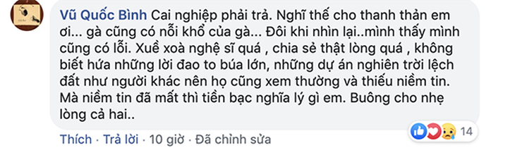 Ngày xưa ổng phải cầm nhà để làm album, mua bài, hoà âm, quay MV, đúng là coi gà như con, chăm bẵm, tập dợt, cho học thanh nhạc, cho học vũ đạo, cho học biểu diễn, cho đi làm đẹp, làm tóc các kiểu! Album ra phải truyền thông họp báo, gửi gắm người này người kia nhờ lên bài, rồi cafe nhậu nhẹt với người này người kia nhờ book show! Tất cả những chi phí đó đều quy bằng tiền! Ngay cả khi nhờ 1 đứa em thân như mình sáng tác, dù mình đã ưu ái cho anh ấy 50% nhưng đó vẫn là số tiền bằng 2,3 tháng lương công nhân! Số tiền anh ấy bỏ ra đó, gà đâu có biết, gà đâu có quan tâm!