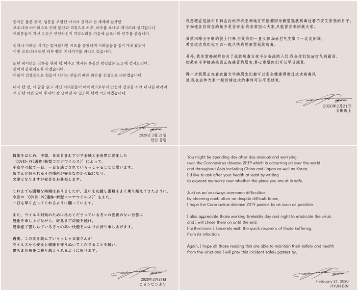 Bức thư của Hyun Bin thể hiện rõ sự quan tâm của nam diễn viên đến mọi người trong tình hình dịch bệnh COVID-19 có những diễn biến khó lường ở nhiều quốc gia châu Á. Hành động này đang nhận được nhiều sự khen ngợi từ người hâm mộ.