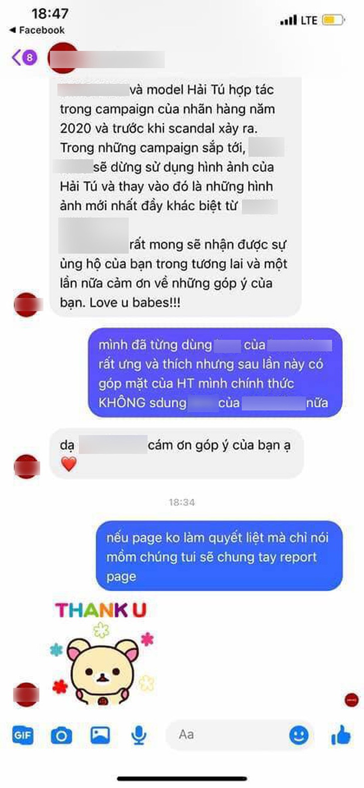 Mới đây, ngày 30-1, thông tin Hải Tú bị nhãn hàng tẩy chay cũng bắt đầu xuất hiện. Cụ thể, trên mạng xã hội vừa lan truyền hình ảnh chụp lại từ tin nhắn với nội dung một nhãn hàng tuyên bố sẽ ngừng sử dụng ảnh của Hải Tú.