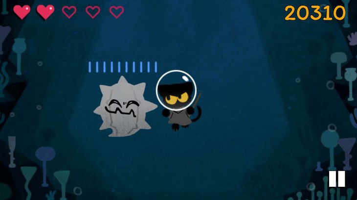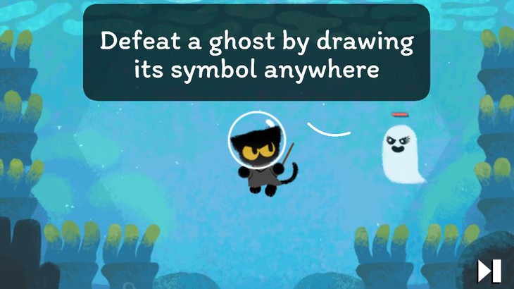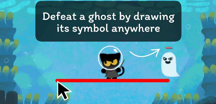 Được biết, cô mèo hắc ám này có tên là Momo. Cô mèo này sẽ được điều khiển bằng cách vẽ lên màn hình những ký hiệu tương ứng, xuất hiện trên đầu của những "con ma". Mỗi lần chơi sẽ có 5 "mạng". Tuy được Google Doodle ban tặng nhiều "mạng" nhưng cấp độ khó sẽ tăng dần theo từng level. Càng lên cao, những "con ma" sẽ xuất hiện nhiều hơn với tốc độ nhanh hơn. Lúc này, sự bình tĩnh và tốc độ sẽ quyết định chuyện thành bại của người chơi.