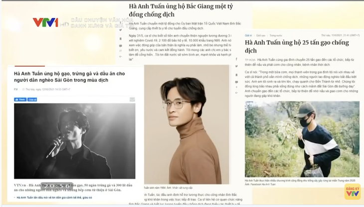 Cùng với đó, phóng sự cũng nhắc đến những hoạt động từ thiện có sức lan toả mạnh mẽ thời gian gần đây của Hà Anh Tuấn: "Hà Anh Tuấn ủng hộ gạo, trứng gà và dầu ăn cho người dân nghèo Sài Gòn trong mùa dịch", "Hà Anh Tuấn ủng hộ Bắc Giang một tỉ đồng chống dịch" hay "Hà Anh Tuấn ủng hộ 25 tấn gạo chống dịch"... đã cho thấy hình ảnh đẹp của người nghệ sĩ mà Hà Anh Tuấn tạo dựng.