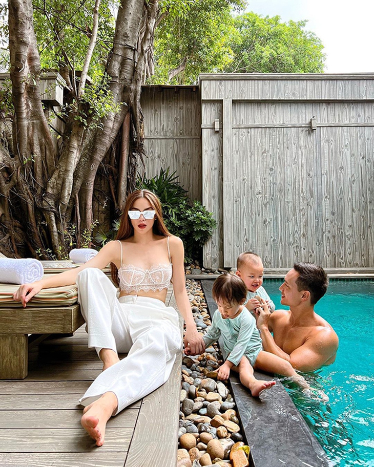 Hôm 27/6, vợ chồng Hồ Ngọc Hà đưa hai con song sinh Lisa và Leon đi nghỉ dưỡng tại một resort ở Bình Dương nhân dịp kỷ niệm 5 năm yêu. Nữ ca sĩ diện váy maxy sexy, trong khi Kim Lý diện quần short khoe body vạm vỡ. Cả hai tình tứ, gương mặt tràn ngập hạnh phúc khi quấn quýt bên nhau.