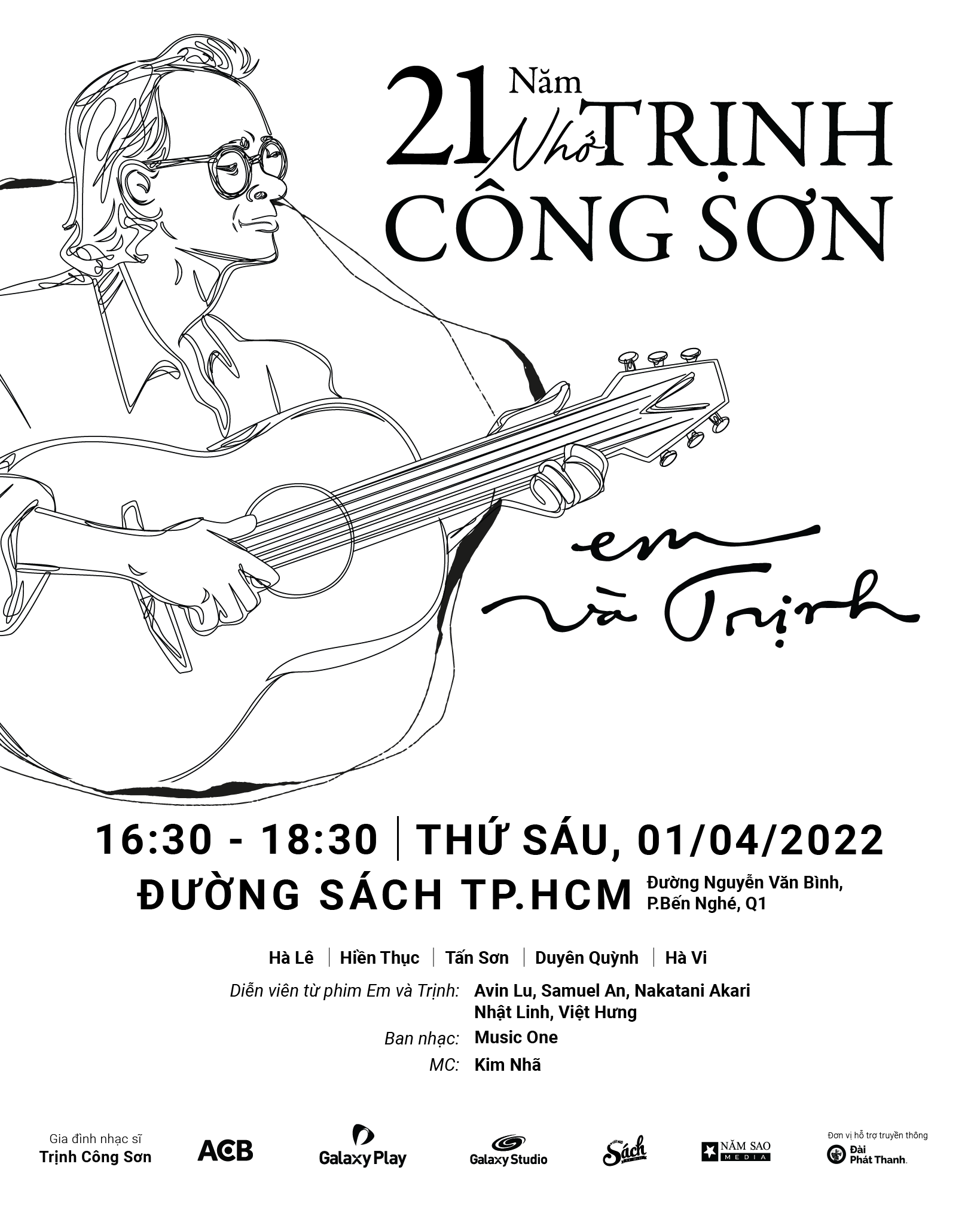 Poster đêm nhạc "21 năm nhớ Trịnh" tại Đường sách TP.HCMNhân kỷ niệm 21 năm ngày mất của cố nhạc sĩ Trịnh Công Sơn, gia đình nhạc sĩ cùng ê-kíp phim điện ảnh Em và Trịnh phối hợp tổ chức đêm nhạc tưởng nhớ người nhạc sĩ tài hoa. Đêm nhạc với sự góp mặt của nhiều ca sĩ tên tuổi như: Hà Lê, Hiền Thục, Tấn Sơn, Duyên Quỳnh và Hà Vi.