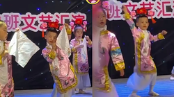 Đang diễn văn nghệ, hai bé bất ngờ quay sang đánh nhau nhưng vẫn không quên hoàn thành tiết mục khiến khán giả không nhịn được cười.