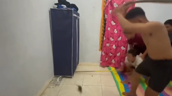 Hai bố con sợ chuột nhảy lên ghế ngồi để một mình vợ rượt bắt