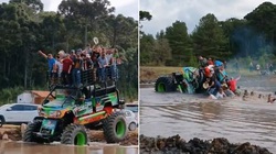 Hai chàng trai chơi flyboard nhưng vì quá trọng tải nên cả hai không bay lên được khỏi mặt hồ khiến nhiều người xem phì cười.