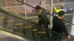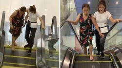 Hai người phụ nữ đi bộ ngược chiều trên cầu thang cuốn, khiến họ đi mãi mới lên được tầng 2 ở trung tâm thương mại.