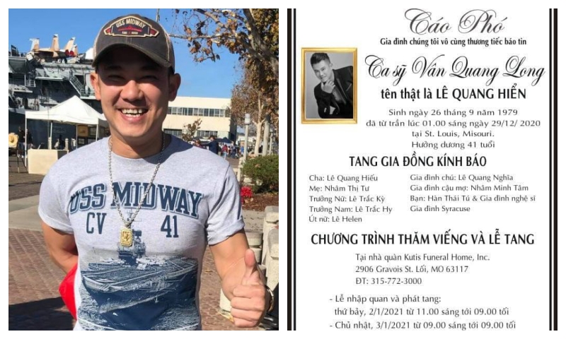 Thông tin lễ tang ca sĩ Vân Quang Long ở Mỹ đã được thông báoChiều 31-12, ca sĩ Hàn Thái Tú đã chính thức công bố cáo phó của ca sĩ Vân Quang Long ở Mỹ. Theo cáo phó, chương trình thăm viếng và lễ tang sẽ được diễn ra tại nhà quàn Kutis Funeral Home trong ba ngày, từ 11h sáng đến 9h tối ngày thứ Bảy 2-1-2021; từ 9h sáng đến 9h tối vào ngày Chủ nhật 3-1-2021; từ 9h sáng đến 12h trưa thứ Hai 3-1-2021. Lễ hỏa táng của cựu thành viên nhóm 1088 sẽ được diễn ra lúc 12h45 ngày 3-1.