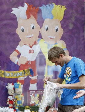 TTCT - Trong ảnh là một CĐV xem lại những món hàng anh mới mua tại một cửa hàng bán quà lưu niệm Euro 2012 ở Kiev (Ukraine).