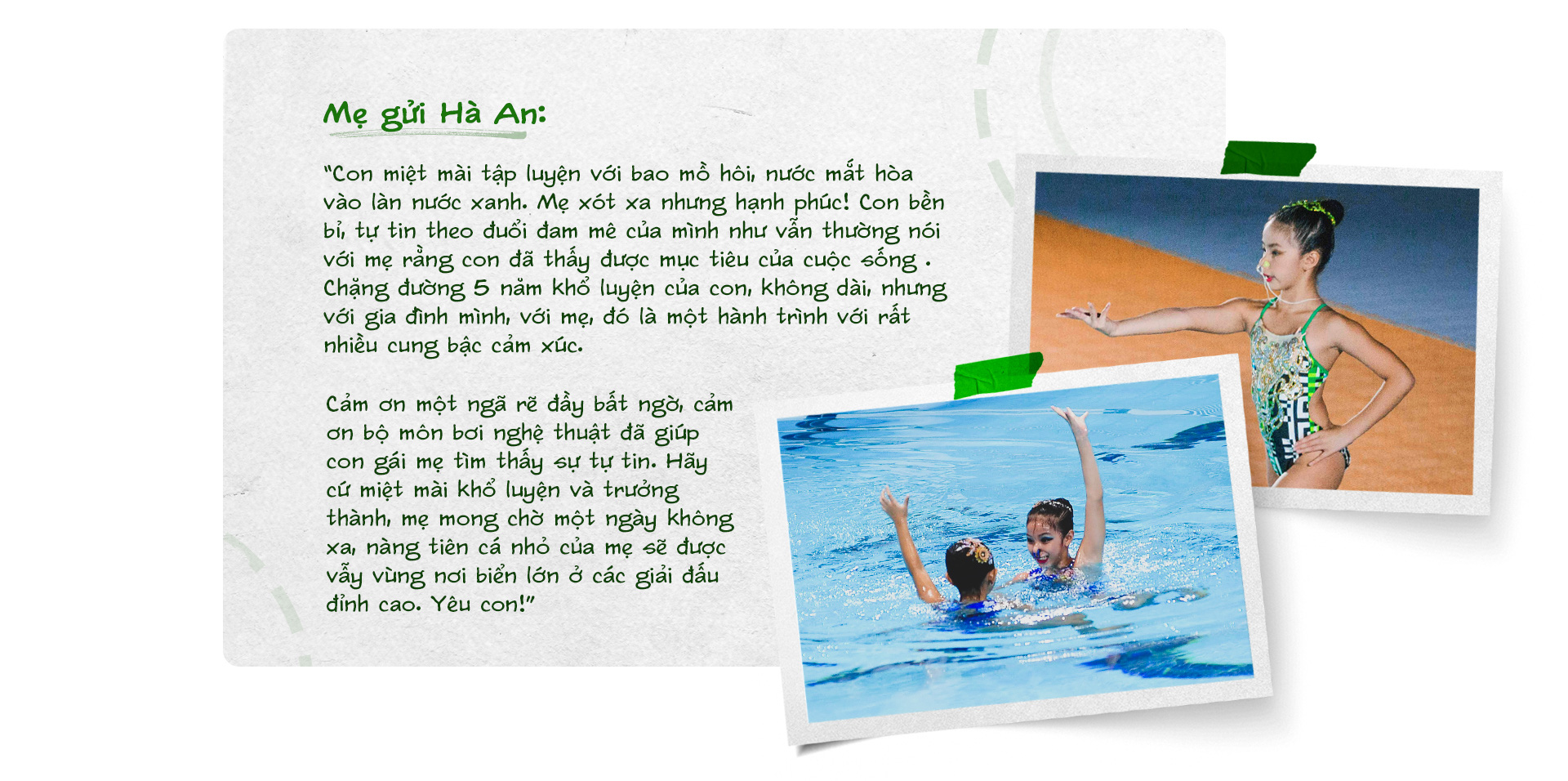 Đó cũng là lúc bản năng một người mẹ lên tiếng mách bảo phải tìm cho con một môn thể thao vừa rèn luyện sức khỏe, tinh thần phấn chấn và nhất là cho con một môi trường vui chơi tiếp xúc với nhiều điều mới mẻ. Và mẹ chọn bơi lội bởi mẹ thấy nụ cười hiếm hoi đã nở trên môi Hà An mỗi khi được đùa mình trong làn nước xanh. Đó là niềm hạnh phúc lớn lao đối với một người mẹ.