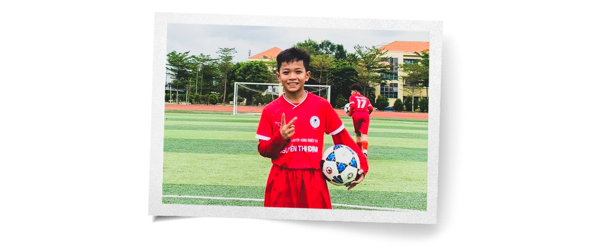 Bất chấp những lần ngắt quãng vì dịch Covid-19, ở sân Hoa Lư, đội trẻ TPHCM tập luyện ngày đêm. Như lọt thỏm giữa những cầu thủ tuổi 20 đang nô đùa với trái bóng là một cậu bé mặc trang phục khác biệt hoàn toàn so với những đồng đội còn lại.