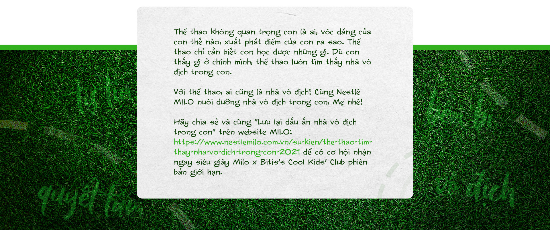 Sự tự tin, bền bỉ, quyết tâm là những giá trị đáng quý mà thể thao đã tìm thấy trong con thông qua hành trình vượt qua rào cản và định kiến để trở thành nhà vô địch trong cuộc sống. Cảm ơn MILO đã đồng hành cùng trẻ em Việt Nam trong hành trình tìm thấy những giá trị đáng quý ấy, giúp trẻ phát triển toàn diện hơn.