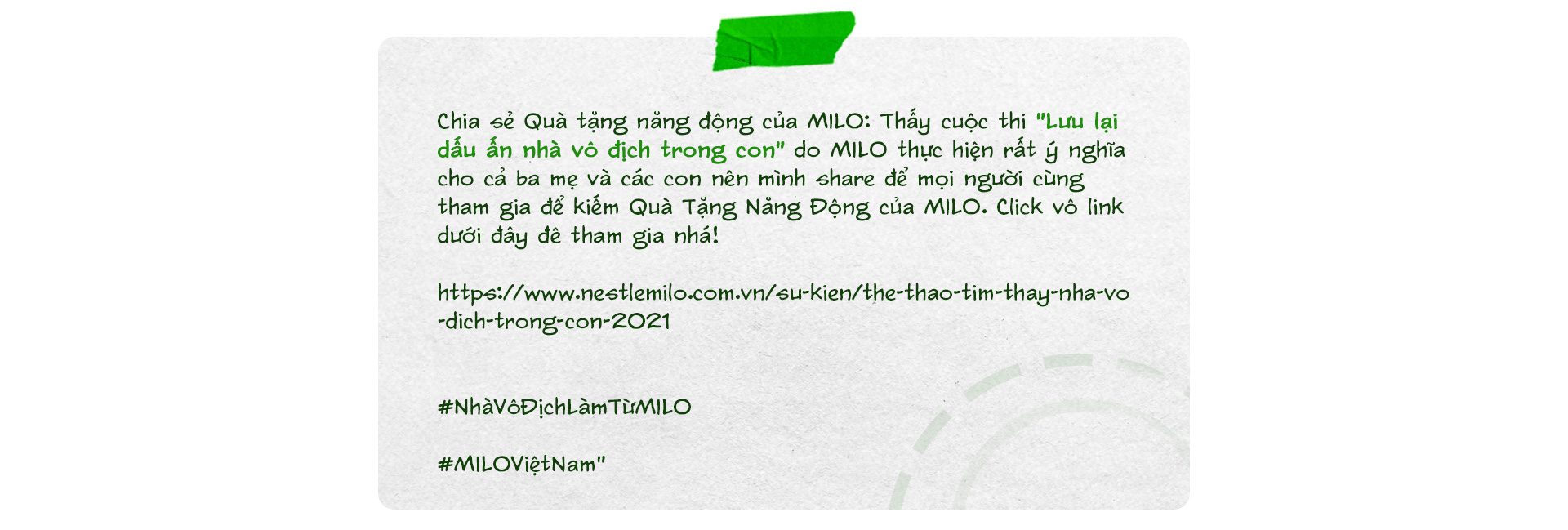 "Đọc thông điệp của MILO ‘Dù con thấy gì ở chính mình, thể thao luôn tìm thấy nhà vô địch trong con’, tôi ngẫm lại thấy rất đúng, ý nghĩa và cũng nhớ đến câu chuyện thể thao của con trai nhà mình.