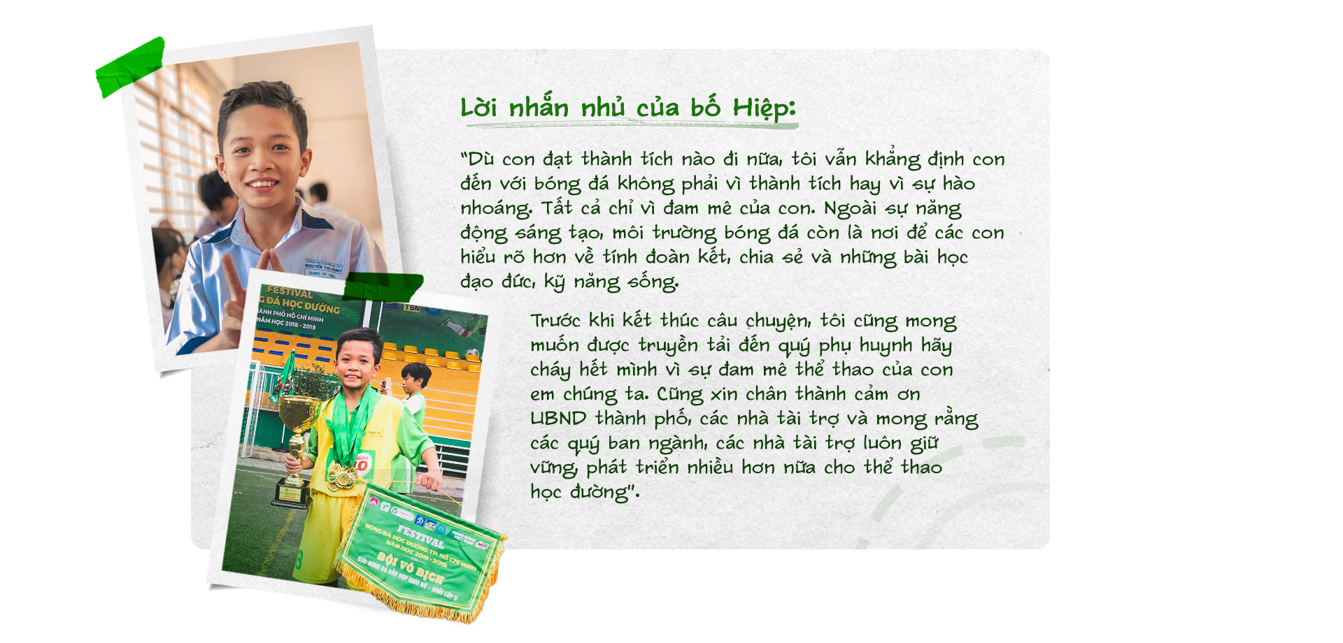 Nhưng năm tháng trôi đi, dường như niềm đam mê thể thao và những kỹ năng trong môn thể thao vua đã tôi luyện con trở nên lanh lẹ, hoạt bát và có đôi chút bền bĩ thể lực hơn các bạn cùng trang lứa. Cuối cùng sự đam mê, nỗ lực tập luyện và thi đấu đã đem lại những kết quả ngoài sự mong đợi của tôi và gia đình.
