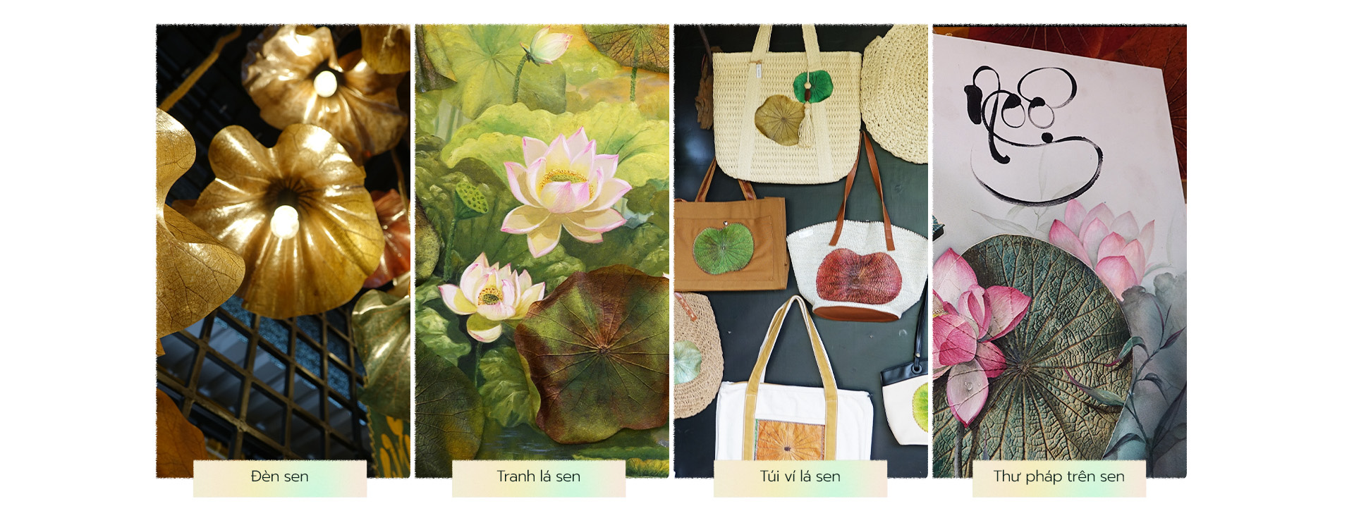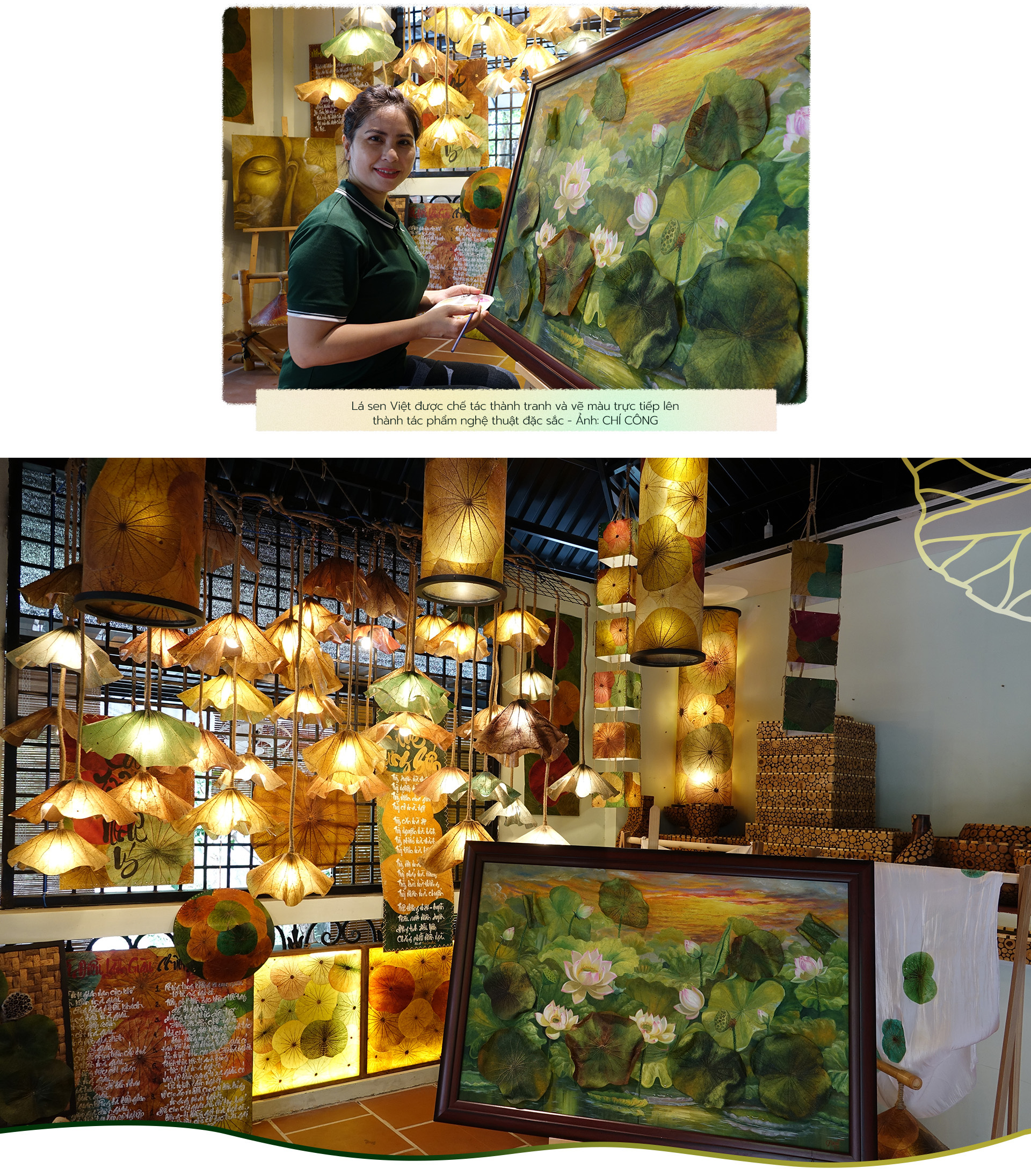 "Chúng tôi có 4 sản phẩm chính từ lá sen, gồm đèn sen, tranh lá sen, túi ví lá sen và thư pháp trên sen", anh Thái cho biết thêm.