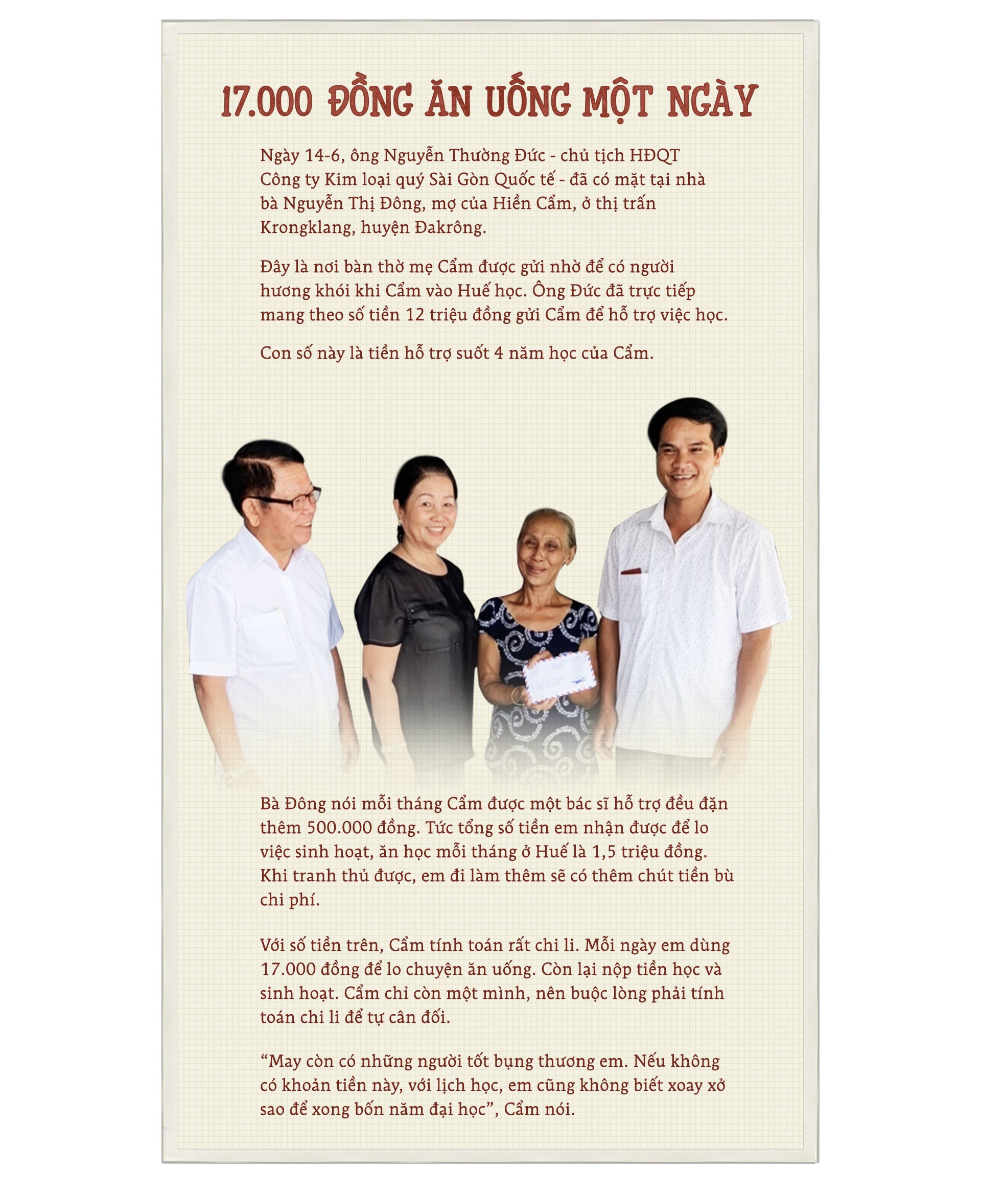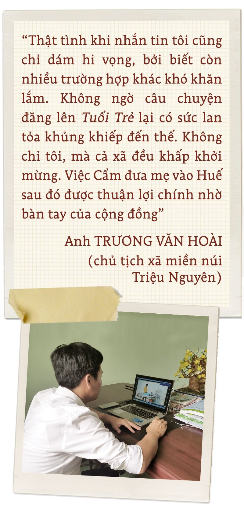 "Tôi ở không xa thôn Na Nẫm nên hiểu quá rõ hoàn cảnh gia đình này. Biết tình cảnh trớ trêu mà Cẩm đang trải qua. Và tôi đã quyết định nhắn tin cho phóng viên báo Tuổi Trẻ tại Quảng Trị. Tôi tin trong trường hợp này Tuổi Trẻ sẽ giúp được em", anh Hoài kể.