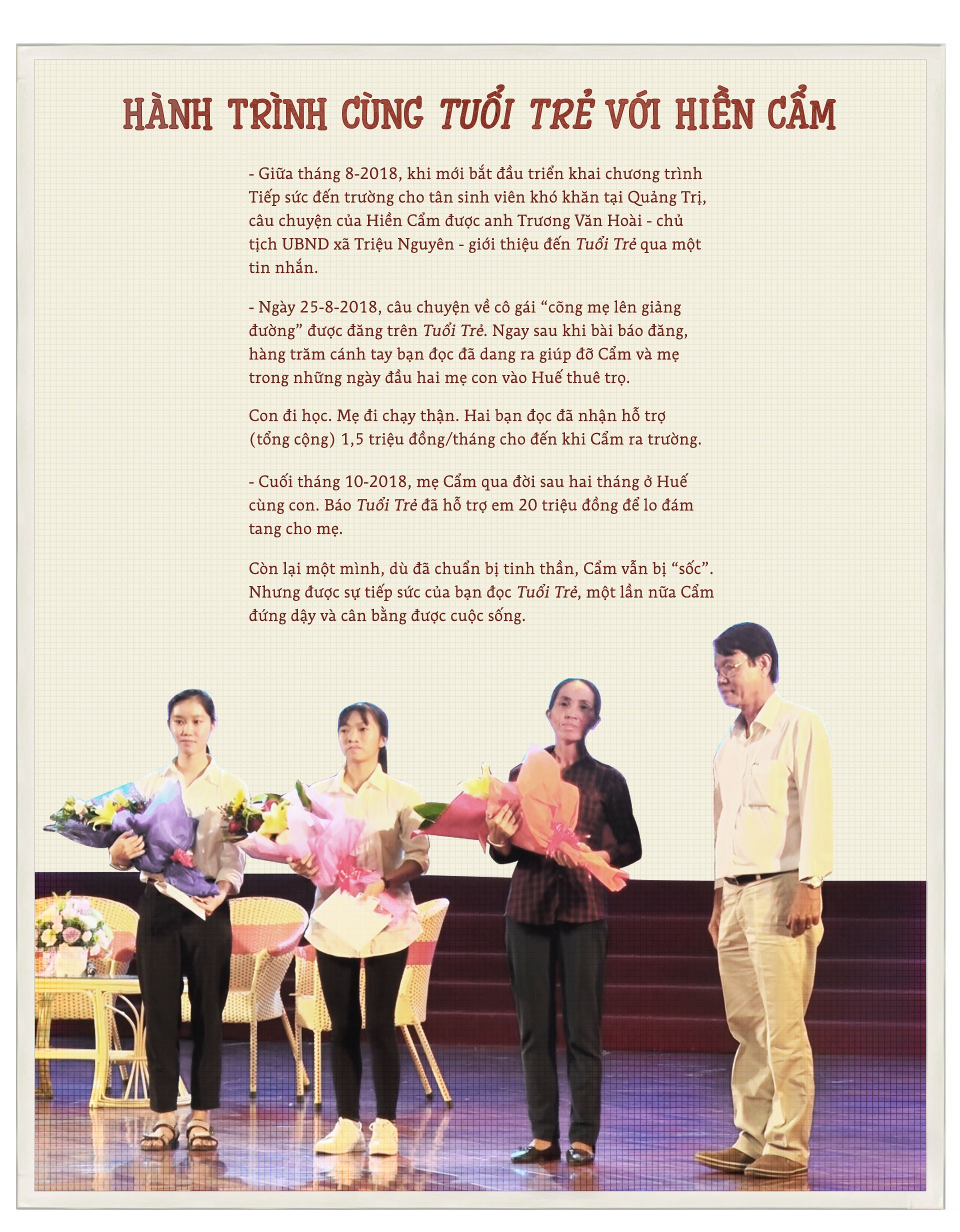 Và rồi, câu chuyện của hai mẹ con Cẩm xuất hiện trên Tuổi Trẻ. Cẩm như được tiếp sức. Từ khắp nơi, những cuộc gọi về chia sẻ với em. Nhiều bàn tay chìa ra níu lấy tay Cẩm.