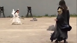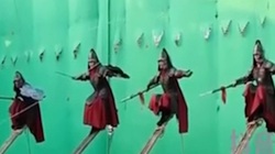 Tài tử Trung Quốc Đinh Vũ Hề cưỡi ngựa giả được 4 nhân viên hỗ trợ khi quay cảnh xung trận trong phim cổ trang 'Sơn hà chẩm' thu hút sự chú ý trên mạng xã hội.