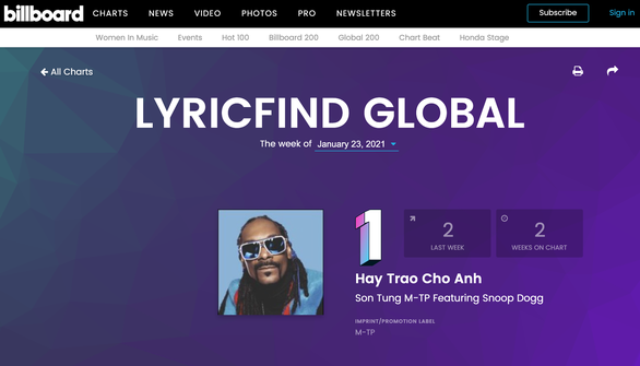 Hãy trao cho anh chiếm vị trí số 1 tại Billboard lyricfind global chartNgày 12-1, các fan của Sơn Tùng vô cùng phấn khởi khi ca khúc Hãy trao cho anh của Sơn Tùng M-TP đã chiếm vị trí thứ 2 trên bảng xếp hạng Billboard lyricfind global chart.