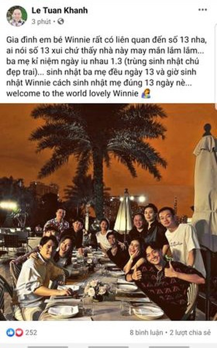 Thế nhưng, trên facebook của anh Lê Tuấn Khanh, quản lý ca sĩ Noo Phước Thịnh - bạn thân của cặp đôi cũng gửi lời chúc mừng và tình cờ hé lộ tên gọi cũng như chi tiết rất thú vị về gia đình nhỏ của Đông Nhi và Ông Cao Thắng. Theo đó, Tuấn Khanh viết: "Gia đình em bé Winnie rất có liên quan đến số 13 nha. Ai nói số 13 xui chứ thấy nhà này may mắn lắm lắm... Ba mẹ kỉ niệm ngày iu nhau 1-3 (trùng sinh nhật chú đẹp trai)... Sinh nhật ba mẹ đều ngày 13 và giờ sinh nhật Winnie cách sinh nhật mẹ đúng 13 ngày nè... Welcome to the world lovely Winnie !"