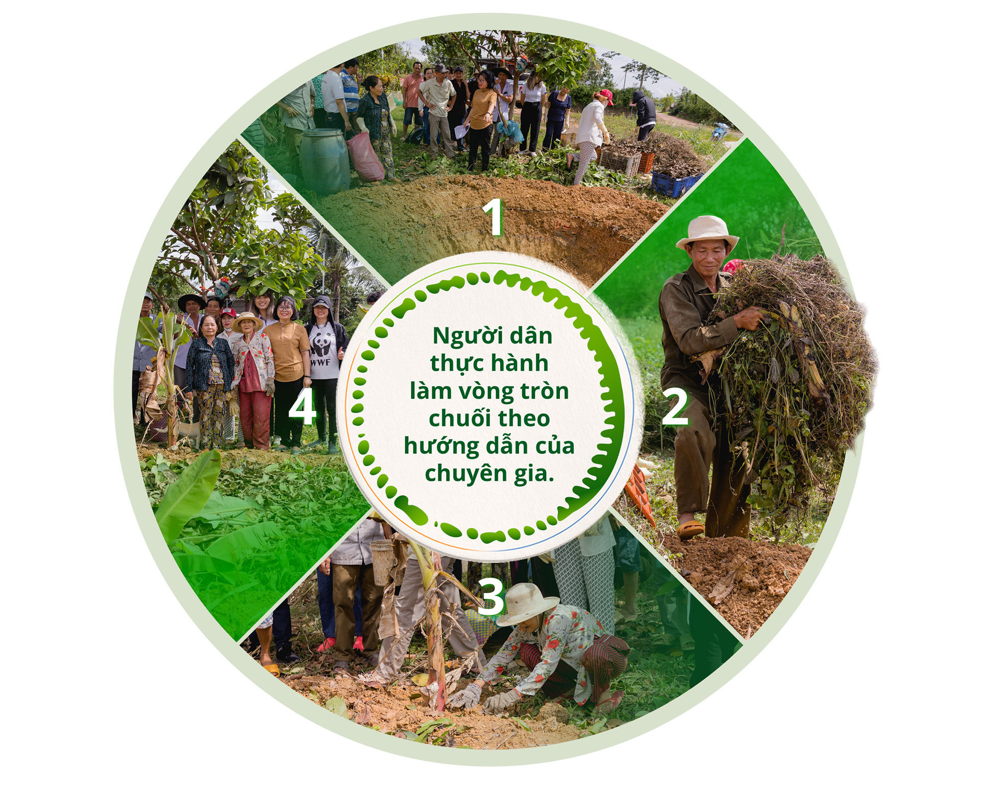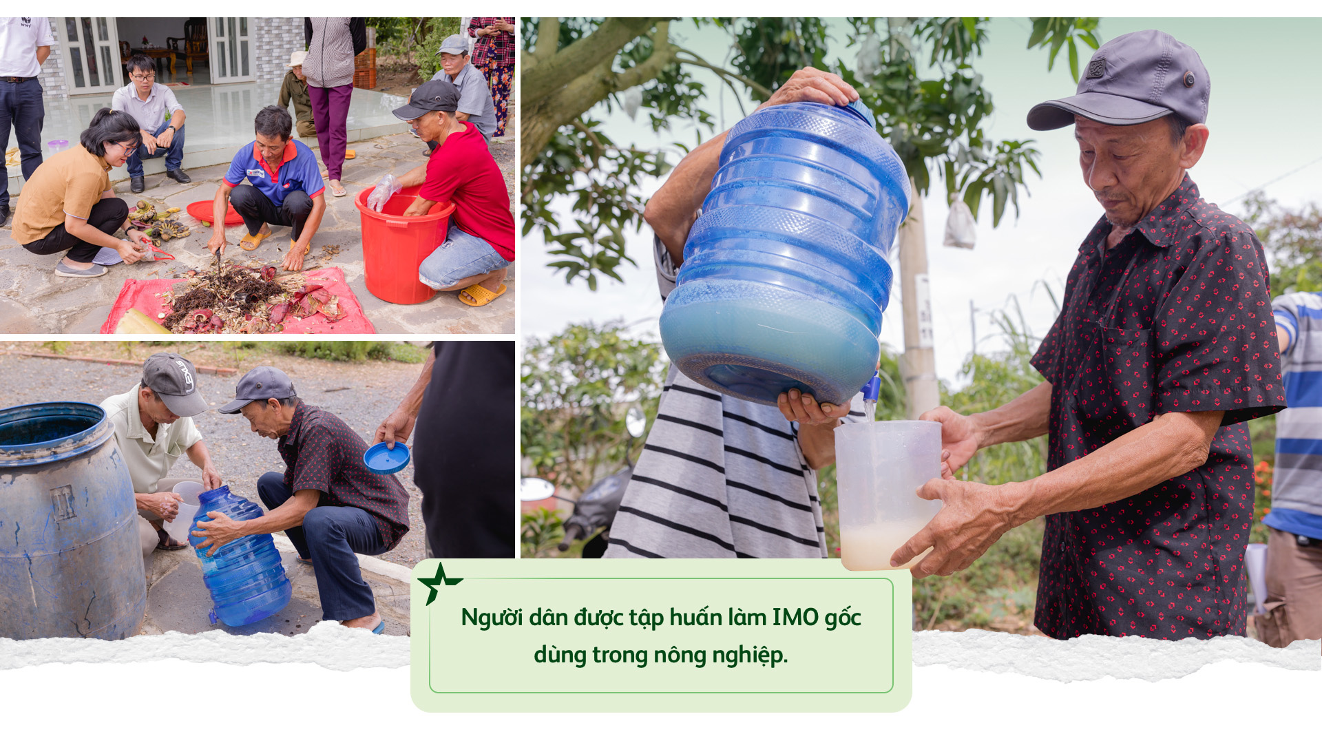 Cũng tại các buổi tập huấn, người dân cũng được tìm hiểu về những giải pháp nông nghiệp thân thiện với môi trường thông qua việc ứng dụng vi sinh vật bản địa (IMO) - chẳng hạn như sản xuất phân bón hữu cơ từ vi sinh vật, thay cho phân bón hóa học và thuốc trừ sâu, từ đó bảo vệ môi trường và nâng cao chất lượng đất canh tác. Người dân địa phương còn được học cách làm vòng tròn chuối nhằm tiết kiệm nước, tăng năng suất cây trồng, giảm thiểu tác động của việc sử dụng phân bón hóa học, thuốc trừ sâu đến môi trường và góp phần xử lý rác thải hữu cơ trong sinh hoạt.