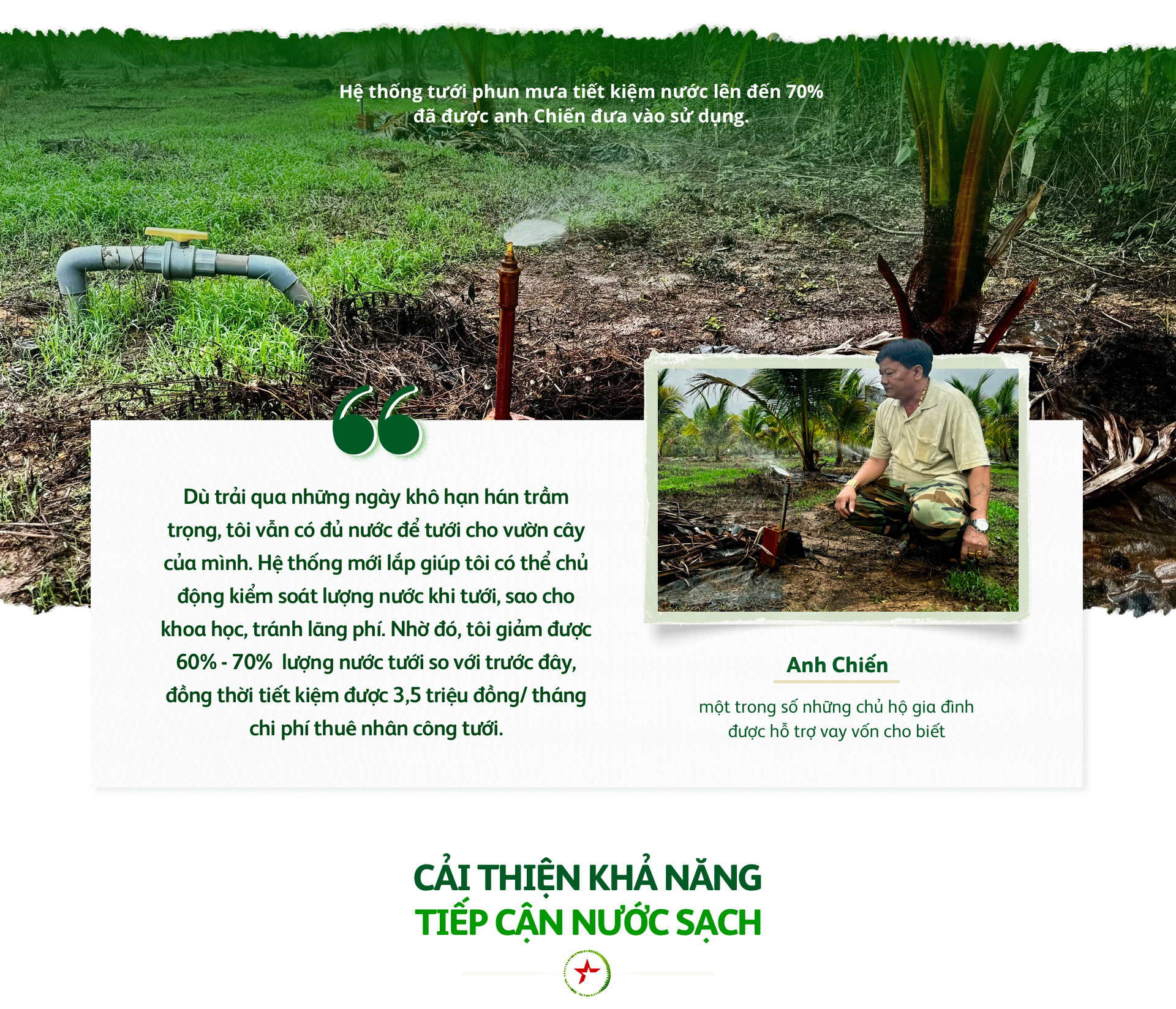 Thông qua chương trình hợp tác bảo tồn nguồn nước, doanh nghiệp còn cung cấp những giải pháp thiết thực giúp người dân cải thiện hiệu suất sử dụng nước trong canh tác hằng ngày. Trong đó, nổi bật là dự án hỗ trợ các hộ nông dân tại huyện Vĩnh Cửu, tỉnh Đồng Nai sử dụng hệ thống tưới tiết kiệm nước từ năm 2023. Thông qua dự án này, 8 hộ gia đình địa phương đã nhận được nguồn vốn xoay vòng không lãi suất đợt 1 do Heineken Việt Nam tài trợ, dưới sự tư vấn quản lý của WWF-Việt Nam để sửa chữa và đầu tư hệ thống tưới phun mưa, giúp tiết kiệm đến 70% lượng nước tưới.