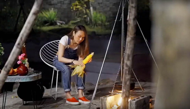 Hết xào rau, Mỹ Tâm chuyển sang nhóm củi nướng ngô, cắm hoa: “Vậy cũng vui!”