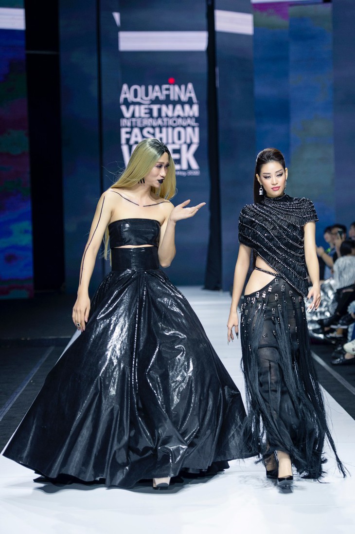 Khánh Vân khoe thần thái đỉnh cao trong thiết kế đen đính đá cá tính của Ivan TrầnBộ đôi "người mẫu" bất đắc dĩ này đã nhận được tiếng vỗ tay phấn khích đầy bất ngờ của khán giả xem show. Về phía Hải Triều, mặc dù không phải là người mẫu chuyên nghiệp nhưng anh khoe thần thái lẫn khả năng catwalk cũng điêu luyện không kém cạnh nàng hậu. Cả hai kết hợp ăn ý và chiếm được nhiều tình cảm của giới mộ điệu thời trang.