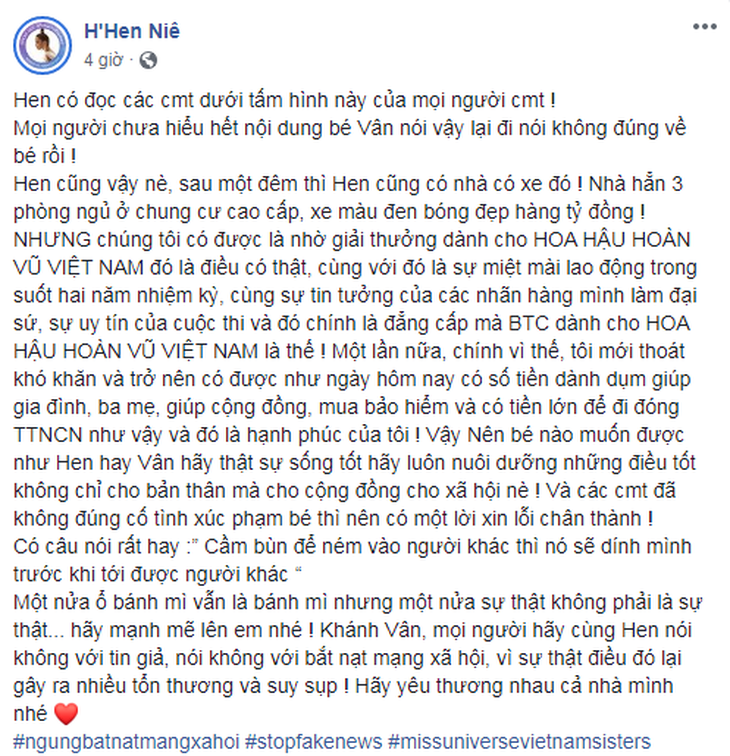 Hoa hậu Hoàn vũ Việt Nam 2017 H'Hen Niê (trái) lên tiếng bênh vực khi cô em Hoa hậu Hoàn vũ Việt Nam 2019 Khánh Vân bị bắt nạt trên mạngTrong dòng trạng thái của mình, H’ Hen Niê tâm sự: “Hen có đọc các bình luận dưới tấm hình này. Mọi người chưa hiểu hết nội dung bé Vân nói, vậy lại đi nói không đúng về bé rồi!".