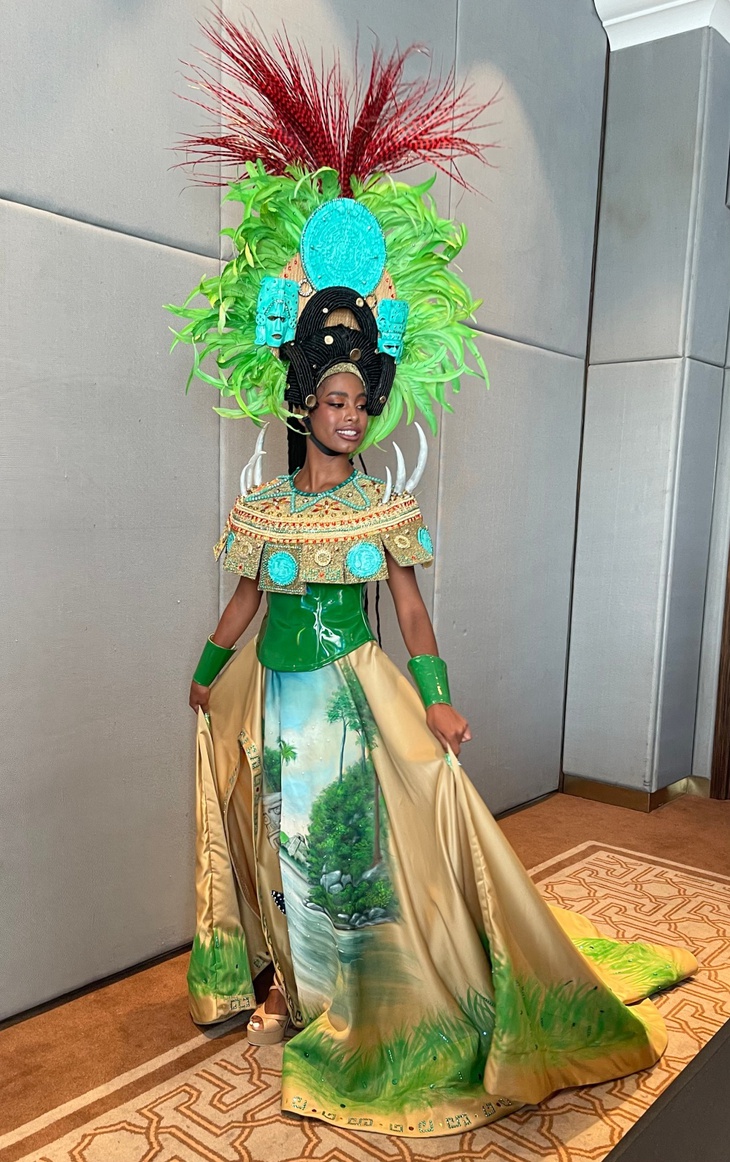 Destiny Evelyn tạo dáng tự tin trên thảm đỏ Hoa hậu các dân tộc Việt NamHoa hậu Destiny Evelyn xuất hiện trong bộ quốc phục được mang đến từ quê hương Belize của mình với màu xanh và vàng chủ đạo. Nàng hậu 26 tuổi được biết đến là một Hoa hậu hoàn mỹ khi sở hữu vẻ đẹp tri thức và nhan sắc xinh đẹp.