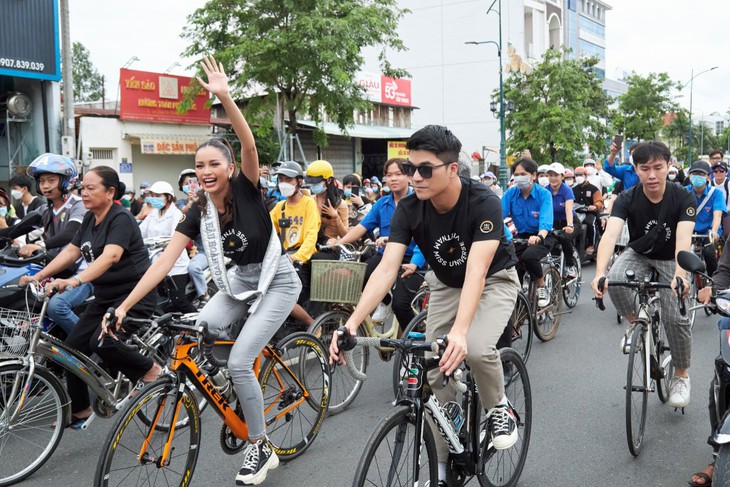 Không chỉ giúp tăng cường về sức khỏe, việc đạp xe đạp còn giúp tiết kiệm nhiên liệu từ thiên nhiên, hạn chế khí thải, góp phần bảo vệ môi trường. Đó chính là lý do Ngọc Châu và ê-kíp lựa chọn phương tiện này cho buổi diễu hành “HomeComing" của Tân Hoa hậu Hoàn vũ Việt Nam.