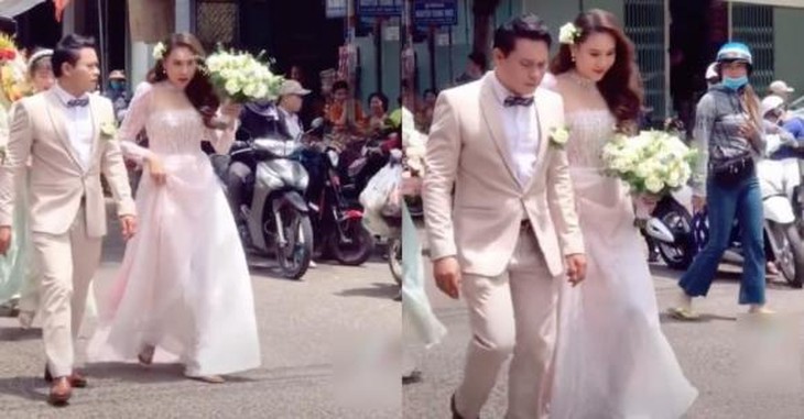 Ông xã của Hồ Bích Trâm trông có vẻ hơi căng thẳng và không tự nhiên khi bước đi trước sự quan tâm của rất nhiều người. Ngoài ra, anh cũng không nắm tay hay dìu vợ như những cặp đôi cô dâu chú rể thường thấy.