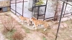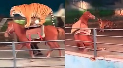 Con hổ đang nằm ngủ, hoảng hồn giật mình vì bị bạn đời lặng lẽ đến hù dọa.