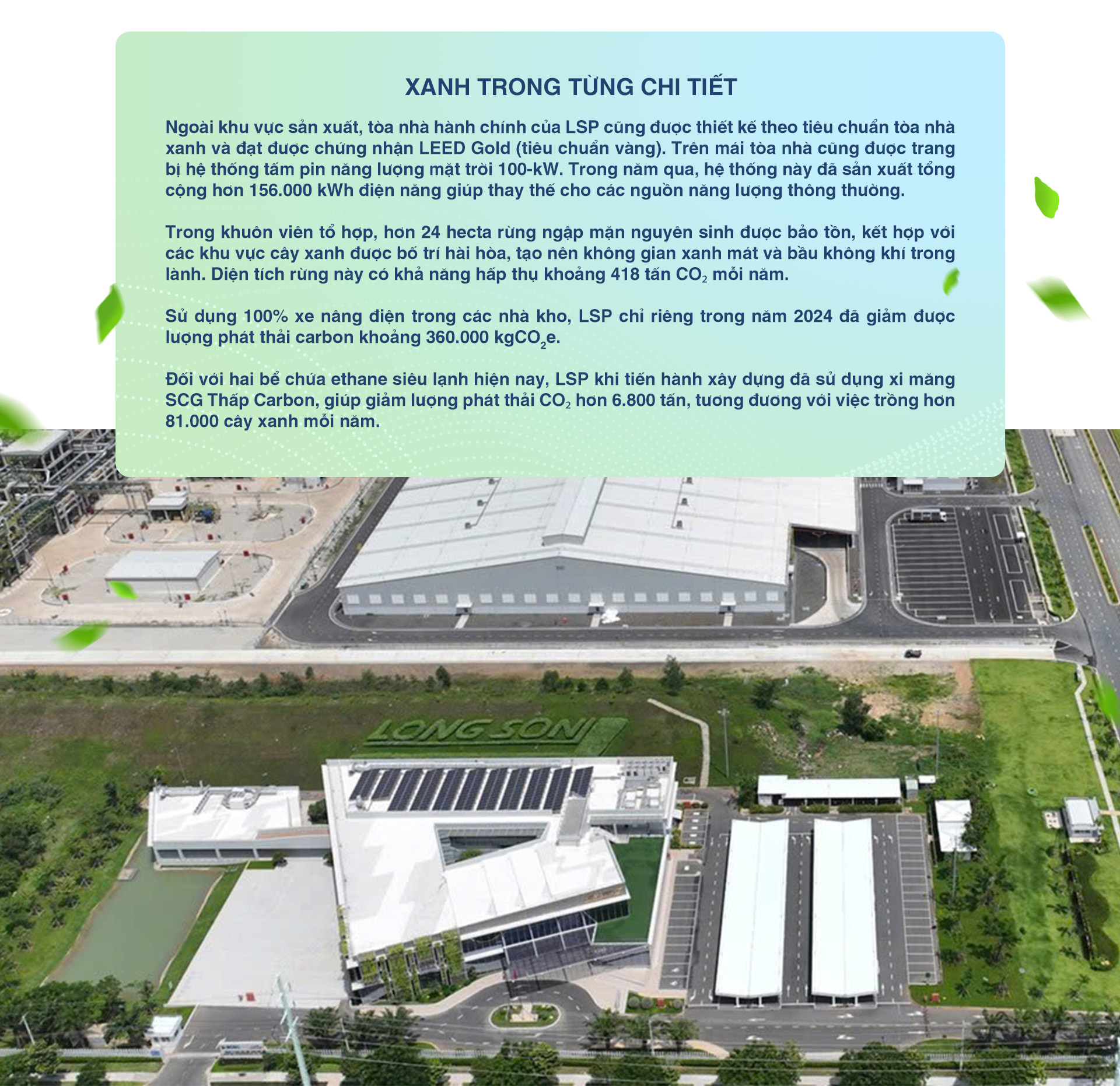 Đặc biệt, điểm nhấn của LSP trong cam kết đồng hành cùng tương lai xanh của Việt Nam là Dự án Cải tạo LSP (LSPE) với trị giá đầu tư 500 triệu USD nhằm tích hợp thêm khí ethane làm nguyên liệu đầu vào, không chỉ nâng cao năng lực cạnh tranh lâu dài của LSP mà còn góp phần giảm lượng khí thải carbon nhờ sử dụng ethane.