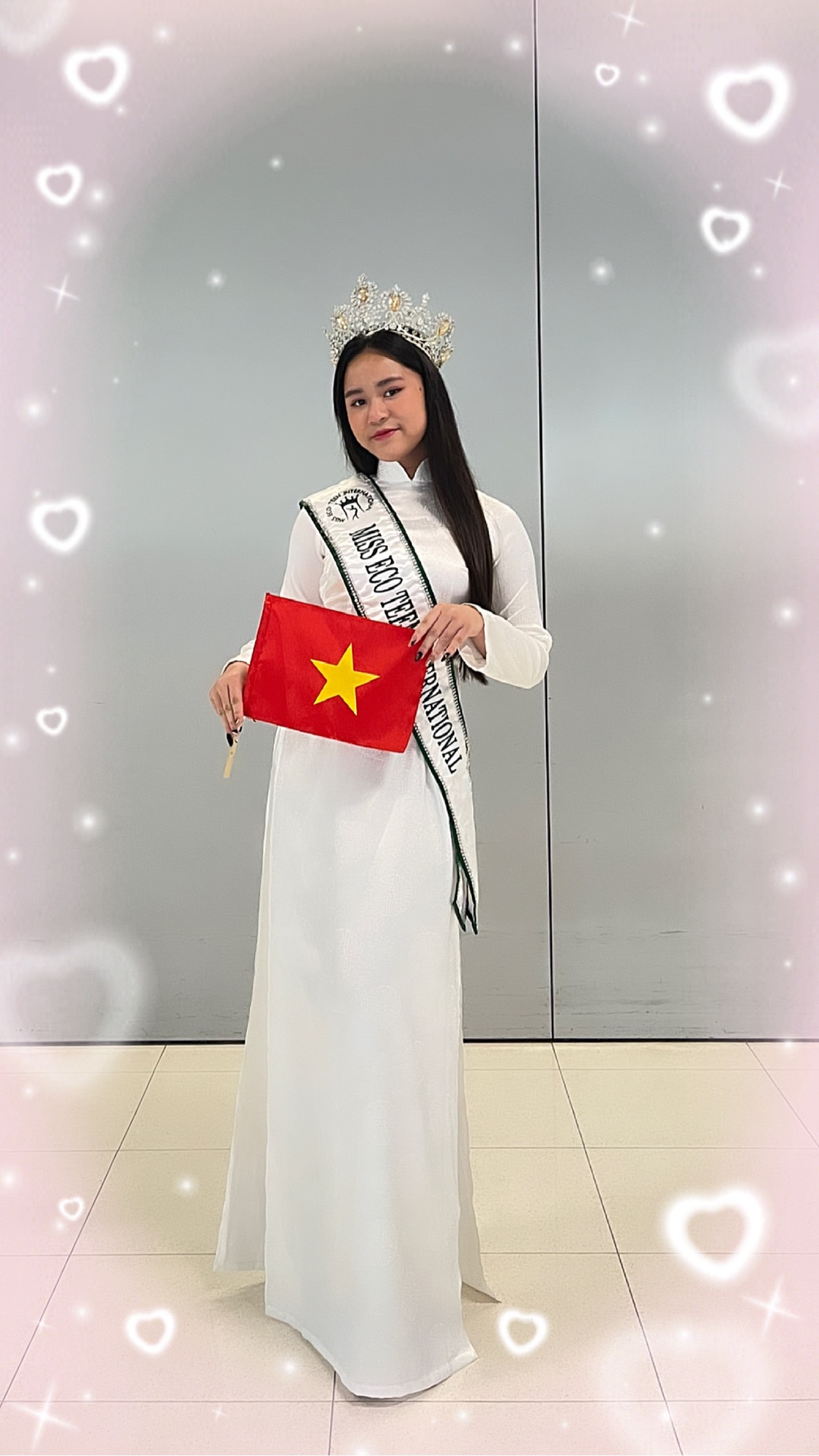 Ngay khi vừa đặt chân đến sân bay, Bella Vũ đã mặc áo dài Việt Nam và cầm lá cờ tổ quốc trên tay.