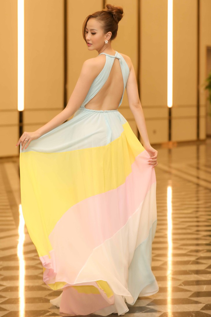 Xuất hiện tại sự kiện, Khánh Ngân gây ấn tượng với vóc dáng mảnh mai, lưng trần vô cùng quyến rũ trong chiếc đầm yếm dài.