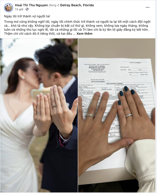 Hoa hậu Thu Hoài khoe nhẫn cưới và tờ đăng ký kết hôn. Hoa hậu Thu Hoài viết: "Trong mơ cũng không nghĩ tới, ngày tôi chính thức trở thành vợ người ta lại tới một cách đột ngột và… khó tả như vậy. Không kịp chuẩn bị bất cứ thứ gì, không xem, không lựa ngày tháng, không luôn cả những thủ lục nghi lễ, tất cả những gì tôi và Trí làm chỉ là ký lên tờ giấy đăng ký kết hôn. Thậm chí chỉ cách đó ít tiếng thôi, cả hai đều chưa hề nghĩ câu chuyện này và như thường lệ, gây nhau một chút vào bữa sáng!