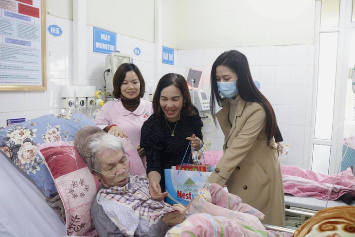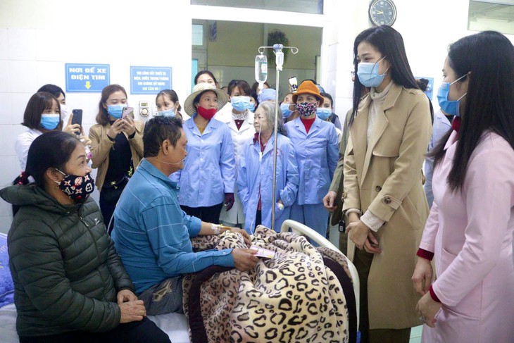 Sau khi thăm hỏi, trò chuyện với ông nội, hoa hậu Đỗ Thị Hà cũng dành những món quà nhỏ gửi đến những bệnh nhân đang điều trị tại bệnh viện huyện ở quê nhà.