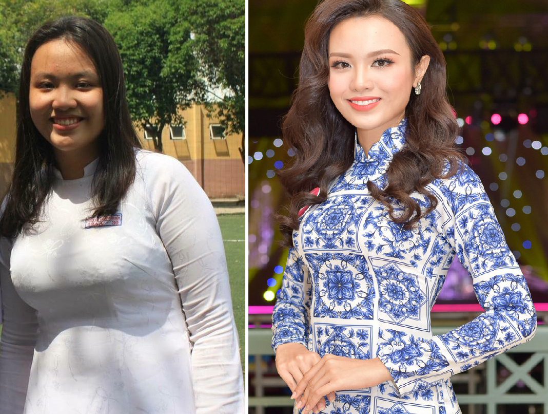 Thủy Tiên khi còn học trung học (trái) và thời điểm tham gia Hoa hậu Việt Nam 2018. Trước đó, Thủy Tiên cho biết cô thuộc tạng người rất dễ tăng cân. Những tháng cuối bậc trung học, việc học khiến cô stress và ăn uống mất kiểm soát. Đỉnh điểm, cân nặng cơ thể lên đến 90kg, làm nữ sinh trung học cảm thấy nặng nề, chậm chạp. Lúc ấy, Thủy Tiên thường chọn quần áo màu đen để che bớt mỡ thừa của cơ thể.
