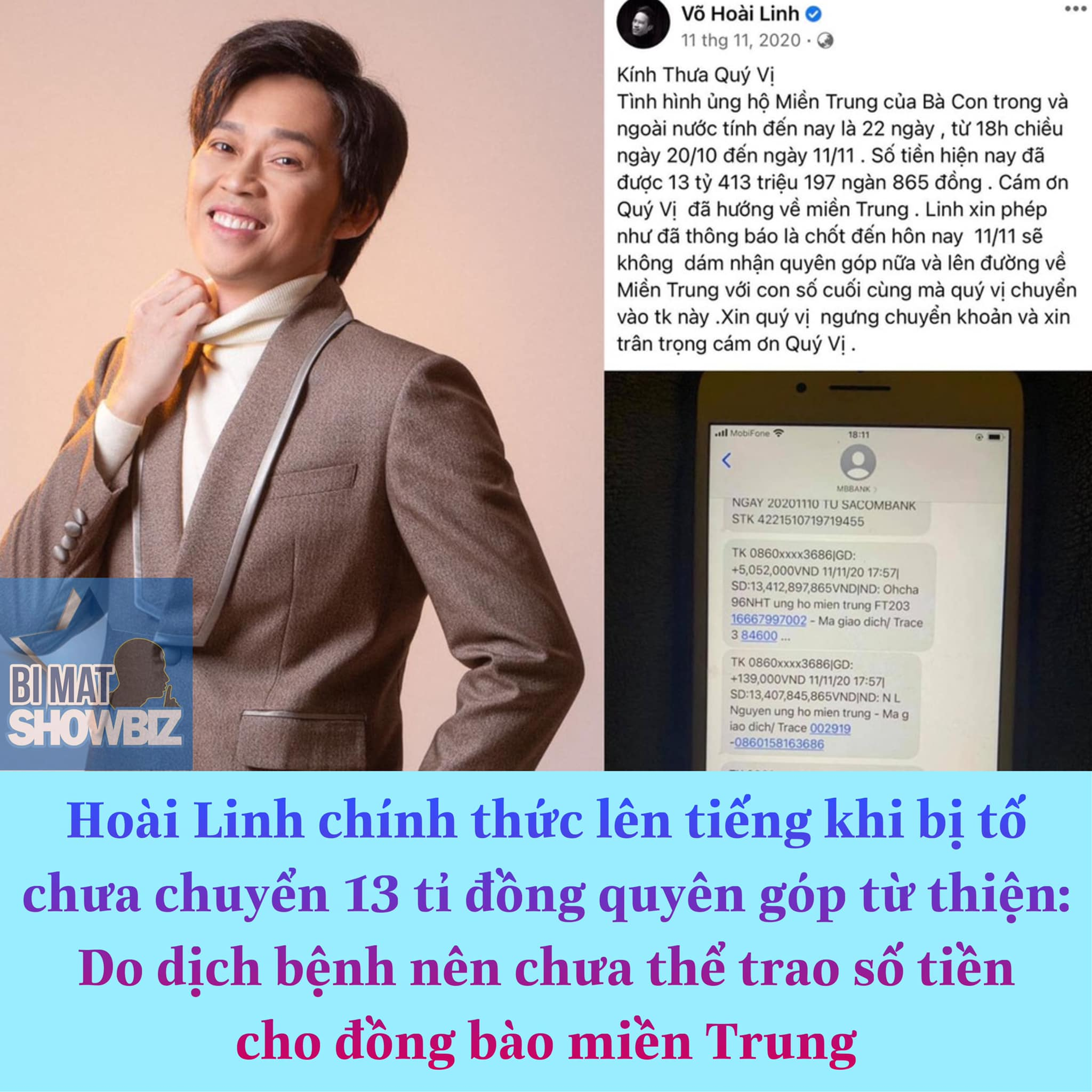 Trước thông tin gây bất lợi cho nghệ sĩ Hoài Linh, trên một fanpage chuyên đăng tin về showbiz đột nhiên đăng tải hình ảnh được cho là thông báo chuyển tiền mang tên Võ Hoài Linh. Theo đó, số tiền chuyển khoản lên tới 14 tỉ đồng (bao gồm tiền mạnh thường quân và cả tiền riêng của Hoài Linh ủng hộ) đã được chuyển vào tài khoản của Ủy Ban Trung ương Mặt trận Tổ quốc Việt Nam với nội dung: "Nghệ sĩ Hoài Linh ủng hộ miền Trung chống lũ".
