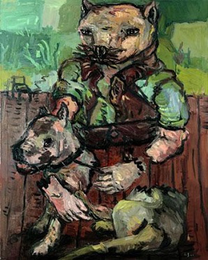 Mèo dáng người trong khắc họa của họa sĩ Đức Baselitz đang hùng hổ nắm giữ chú chó nhỏ bé hơn, vươn tay từ sau hàng rào sang rào chắn bên kia. Chiếc hàng rào tượng trưng cho sự chia cắt biểu tượng của nước Đức hậu Quốc xã, và những trào lưu nghệ thuật mâu thuẫn đang diễn ra ngay trong lòng quốc gia đang hứng chịu chia cắt.
