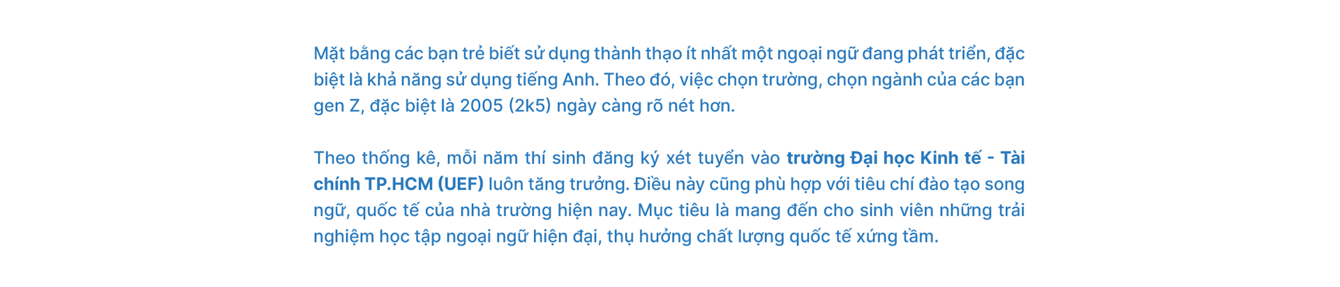 UEF ngày càng đẩy mạnh việc đào tạo tập trung vào ngoại ngữ cũng nhằm đáp ứng xu thế này. Sinh viên trường được tạo nhiều điều kiện thuận lợi để rèn luyện và nâng cấp tiếng Anh trong suốt bốn năm học theo lộ trình cụ thể, phù hợp với đa dạng trình độ.